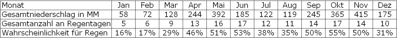 Diese Klimatabelle der Hauptstadt zeigt den monatlichen Gesamtniederschlag in Millimeter sowie die Gesamtanzahl an Regentagen pro Monat sowie die prozentuale Wahrscheinlichkeit für Regen in dem jeweiligen Monat.