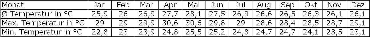 Galle ist eine Stadt an der Südküste von Sri Lanka. Der Klimatabelle unten kann man entnehmen, dass hier ein tropisches Klima vorherrscht. Angenehm ist hier jedoch, dass die durchschnittlichen Temperaturen mit einem Minimumwert im Jannuar mit 25,9 Grad Celsius und einem maximalen Durchschnittswert von ca. 28 Grad im Mai relativ nah beieinander liegen. Dies verspricht ein relativ konstantes Wetter. Auch die maximale Temperatur von 30,6 Grad zeigt, dass an diesem Ort der Südküste nicht extreme Temperaturen zu erwarten sind.