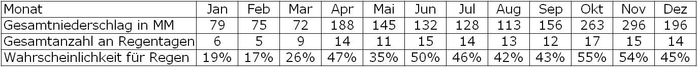 Die Wahrscheinlichkeit für Regen sowie der damit einhergehende Gesamtniederschlag ebenfalls jeweils mit dem monatlichen Wert sind in der folgenden Klimatabelle Kandy abgebildet.