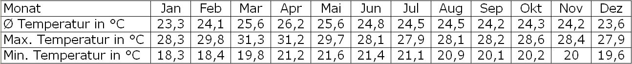 In der folgenden Klimatabelle sind die monatlichen Durchschnittstemperaturen und die Temperaturen mit den maximalen und minimalen Messwerten pro Monat dargestellt.