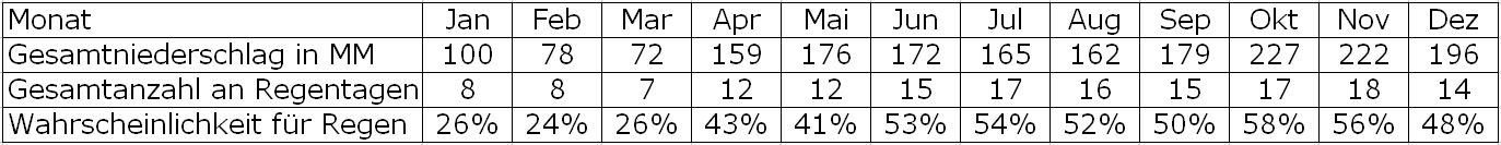 Die Monate Oktober, November und Dezember sind die regenreichsten Monate für das Gebiet um Nuwara Eliya. Jedoch muss man fast die Hälfte des Jahres mit einer 50% Wahrscheinlichkeit für Regen rechnen. Hier kann es sich aber dann auch um Schauer handeln, die nach kurzer Zeit auch schon wieder verflogen sind. Februar und März stellen definitiv die regenärmsten Monate dieses Gebietes dar. Dies ist genau die Hochzeit in der auch viele Einheimische die Zuflucht vor den ganz schwülen Bedingungen an der Küste versuchen zu meiden und darum lieber das Hochland von Sri Lanka wählen.