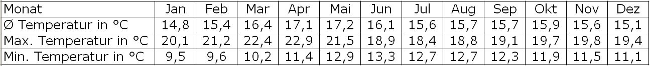 Aus der Klimatabelle ist ersichtlich, dass die täglichen Durchschnittstemperaturen zwischen 14 und 17 Grad Celsius liegen. Die maximale Temperatur liegt im April mit knapp 23 Grad. Solch ein Temperaturwert stellt in vielen Gebieten von Sri Lanka die niedrigste Temperatur, in Nuwara Elya ist es die Höchsttemperatur. Folglich kann man sich auch denken, dass die minimalen Temperaturen mit 9 Grad ebenfalls weit unter dem Landesdurchschnitt liegen.